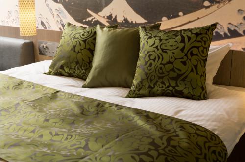 クッションとベッドライナーで魅せるファブリックセット。 グリーンをモチーフにした客室に良く合います。