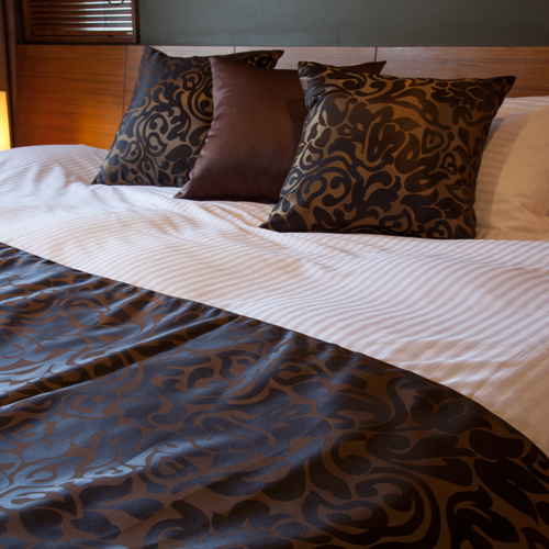 クッションとベッドライナーで魅せるファブリックセット。 茶をモチーフにした客室に良く合います。