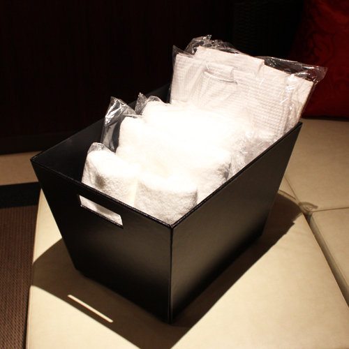 ビニールレザーの脱衣カゴ、脱衣場での利用を考え、底面はアジャスターがついており、芯材にMDFを使用しています。